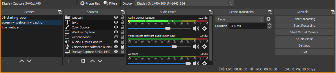 For teaching purposes, this means you have much more control when you are trying to teach online (and in person) since OBS gives you many options on what and how something is presented. OBS also allows you to setup “scenes” so you can potentially share an entire screen, or a specific set of application windows all with separate screen overlays. For me I was able to more efficiently lay out my screen with what I’m presenting, text overlays with quick links, and a live caption as I was teaching.